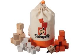 This dreidel game set comes in a cotton travel bag filled with brightly colored wooden cubes of different sizes and a dreidel. Instead of merely tossing them in the “pot” you stack them on top of one another and the person who places the final cube on top without toppling the stack, wins.