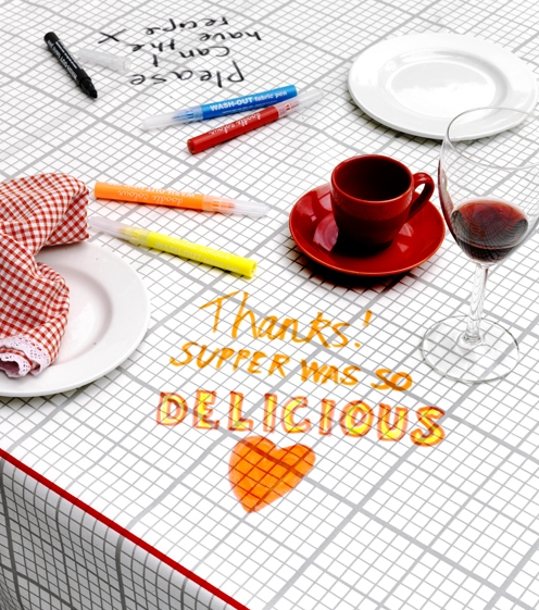 Have the kids practice their cursive to make a menu. Draw guidelines for setting the table. Play hangman while you eat your peas. Or just make the next birthday party the one where you’re the coolest mom ever because the kids got to draw all over the actual tablecloth. –Delilah