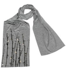 The Glittery Holiday Scarf keeps any sparkle to the front panel which features delicate little pussy willow branches that gently glint in the light. The Metallic Bird in Frame Scarf has a little bird picture in metallic bronze on a lighter oatmeal-heather color. And the creamy softness comes from a combination of soft silk and lyocell, an eco-friendly fiber. When I say my daughter is sensitive to clothing, that is putting it mildly, but when she tried on the sample Shirin sent us, she was hooked at the first wearing.