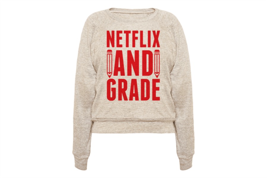 Because we know how much teachers do for our kids, and how awesome they are, we just had to share this hilarious Netflix and Grade shirt from Look Human (we love that shop, by the way). It’s a pretty clever (and school appropriate) play on the whole “Netflix and Chill” thing.