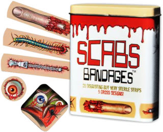 Is there anything as sweet as comforting your kid after a scrape with a smooch, a kind word, and… bandages with pictures of bloody eyeballs, dismembered fingers, and centipedes crawling out of skin?